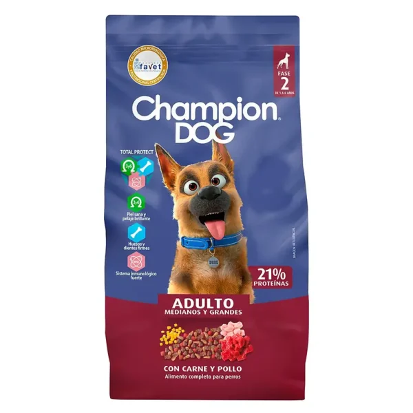 La felicidad de tu perro se alimenta todos los días y en cada momento que compartes junto a él. Disfrutando tarde de juegos, paseos al parque y cariños por montón le demuestras lo importante que es para ti… Porque verlo feliz te hace feliz. Junto a esto, una buena alimentación es fundamental para mantener su salud y bienestar. Champion Dog Adulto te ofrece un alimento completo y balanceado, especialmente formulado para satisfacer todos sus requerimientos nutricionales.